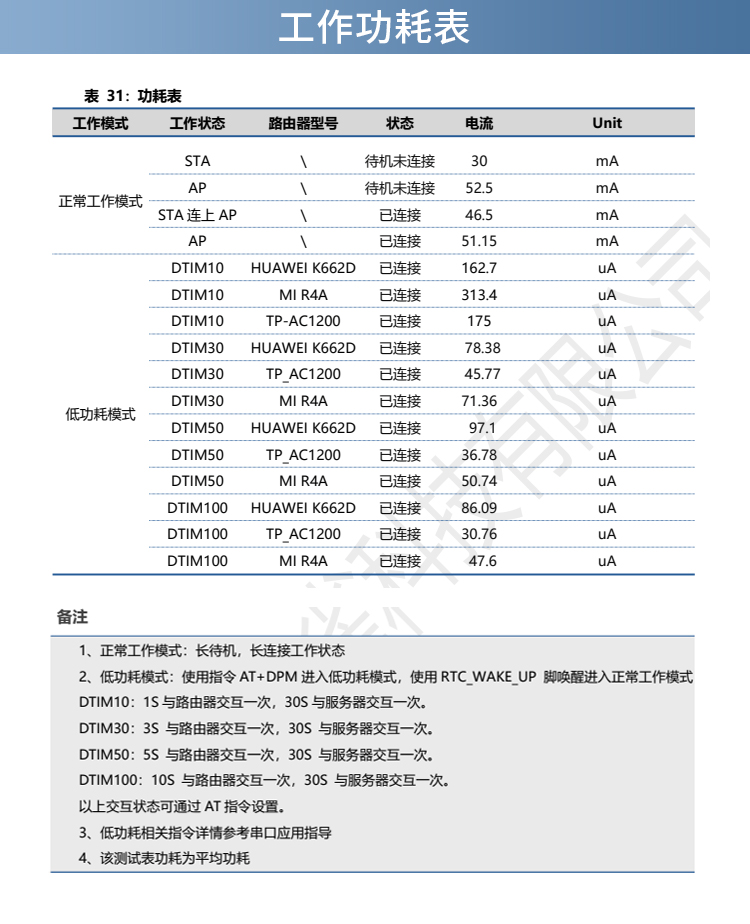超低功耗:DTIM 10 --功耗 162.7uA DTIM100--功耗 30.76uA